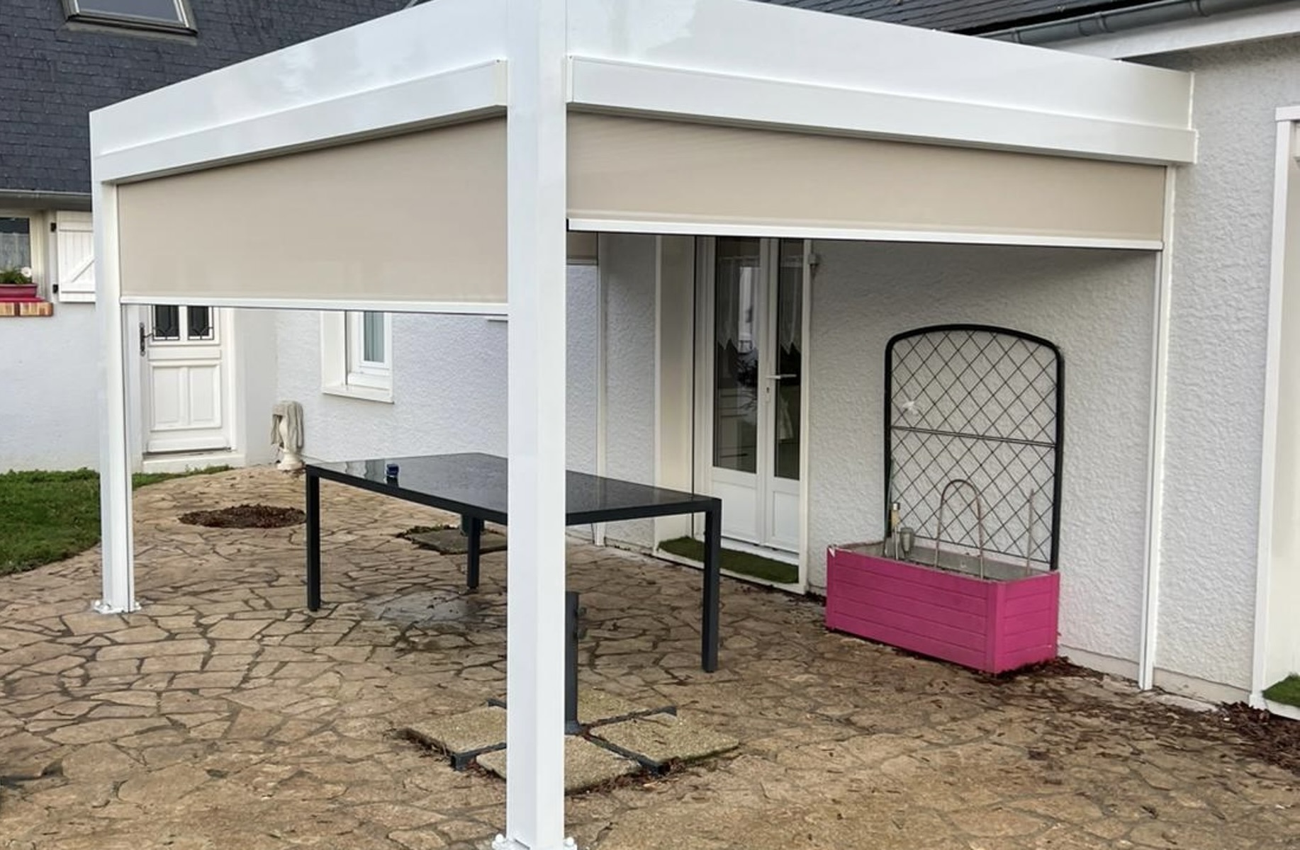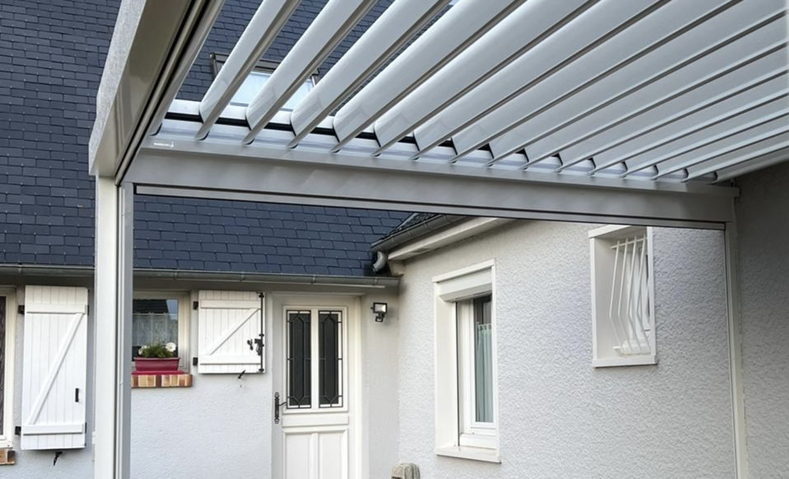 Installation d'une pergola bioclimatique moderne, offrant à la fois protection solaire, abri contre la pluie légère et confort au quotidien.