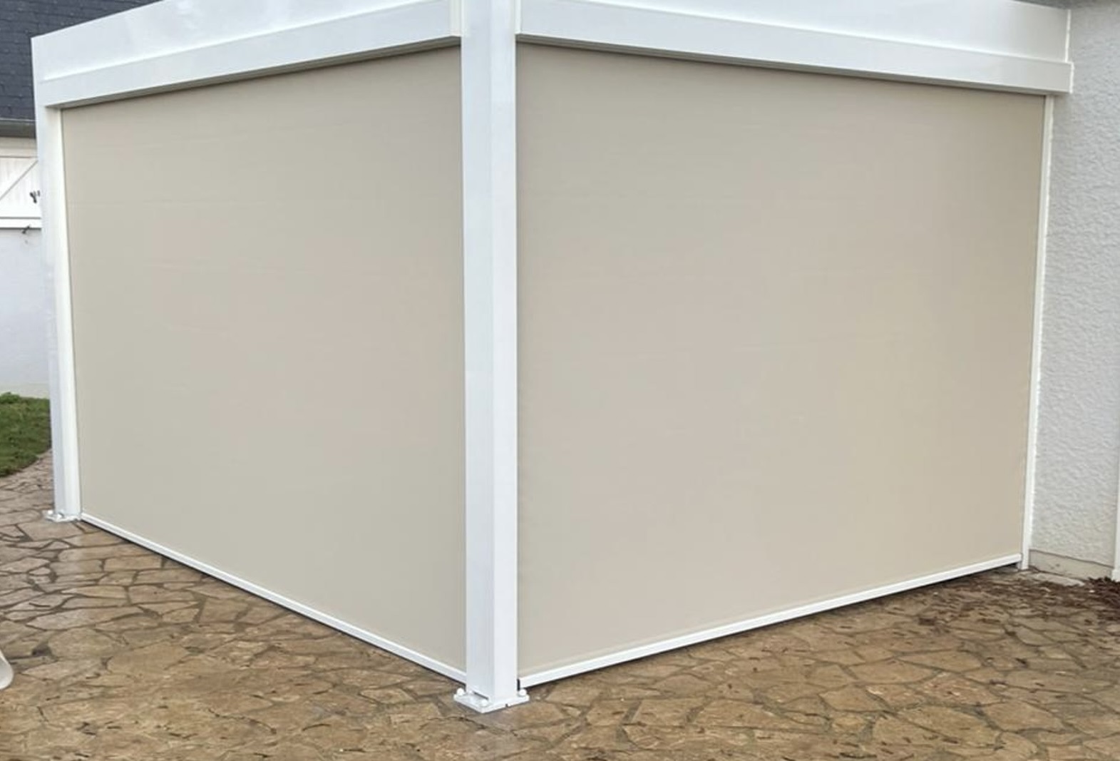 Le projet a été complété par des stores verticaux latéraux type ZIP, assurant une protection supplémentaire contre le vent, le soleil rasant et les regards.