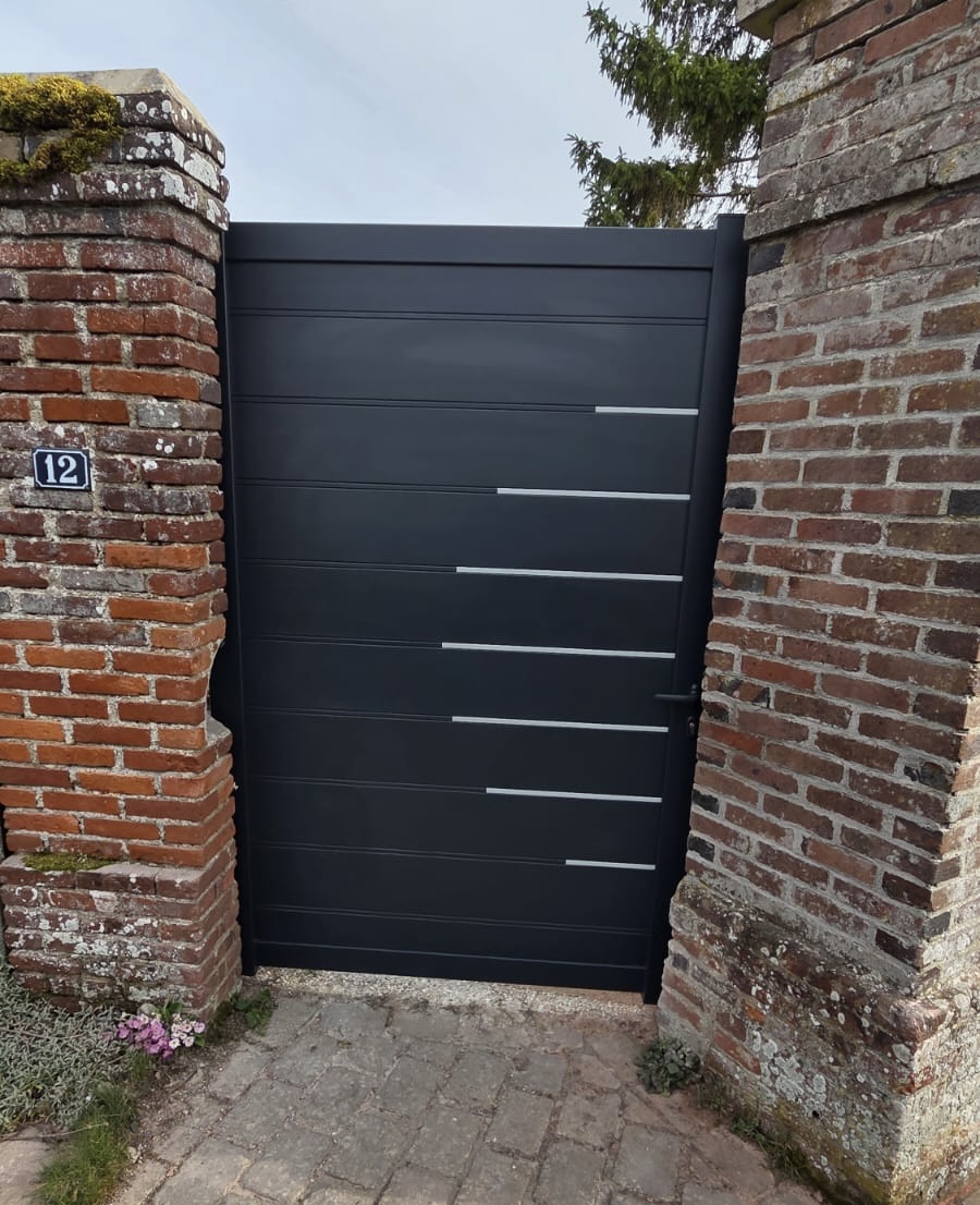 Grâce à cette installation à Guichainville (27930), l'entrée de la propriété est entièrement transformée : moderne, sécurisée, motorisée et parfaitement intégrée aux piliers en brique d'origine. Chez HOMISO, chaque chantier est réalisé par nos propres équipes, sans sous-traitance.